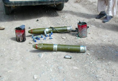 Volgens het ministerie van defensie gaat het vermoedelijk om 107mm raketten. Normaal horen die dingen thuis in een mini-Stalinorgel, maar bij gebrek aan dit stukje hardware zijn de losse en ongeleide raketten een favoriet projectiel van de Taliban geworden. Onderstaand een foto van het Britse ministerie van defensie van twee van zulke raketten, voorzien van een geïmproviseerd ontstekingsmechanisme.