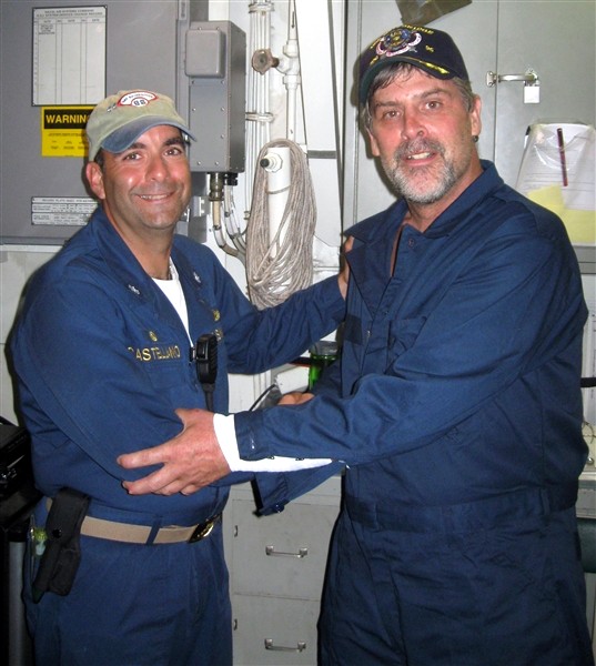 (Foto Pentagon: kapitein Richard Phillips, rechts, kort na de actie van de afgelopen nacht. Links op de foto de kapitein van de Bainbridge, Frank Castellano)