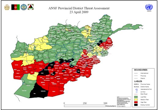 De afgelopen weken is er her en der bericht over een ‘geheime’ kaart die de Afghaanse autoriteiten hebben gemaakt van de veiligheidssituatie in het land. Die kaart bestaat inderdaad, circuleert her en der, en ook de Wereldomroep heeft een exemplaar toegestuurd gekregen. Onderstaand die ‘ANSF Provincial/District Threat Assessment‘, gedateerd op 23 april j.l. ANSF staat voor Afghan National Security Forces. Als u de kleine lettertjes niet kunt lezen: dat komt door de mate van detail. De kleurencode: groen = laag risico; geel = gemiddeld risico (vraag me niet wat ‘gemiddeld’ is…); rood = hoog risico en de zwart gekleurde delen van het land zijn in handen van de vijand (Taliban etc.)