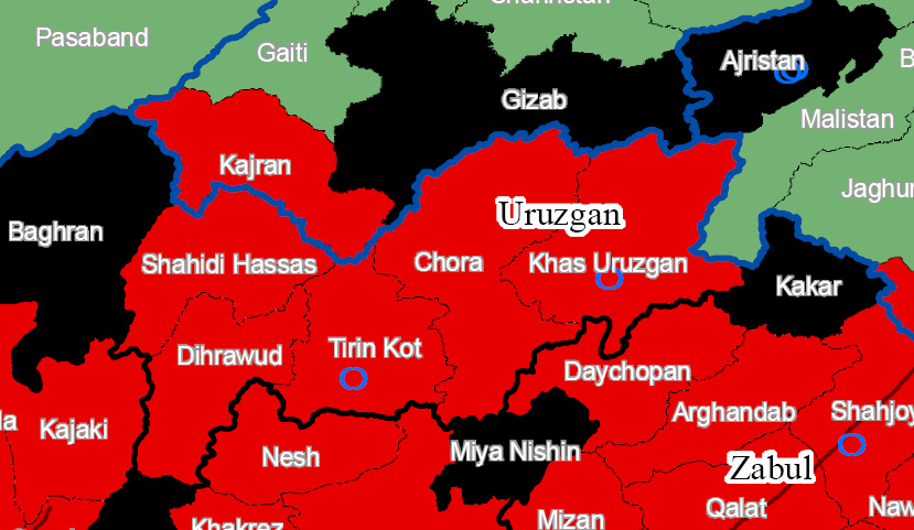 Het probleem met dit soort kaarten is dat ze de veiligheidssituatie op macroniveau weergeven. Bínnen provincies en districten kan de veiligheidssituatie echter sterk verschillen. Dat toont onderstaand detail van de kaart aan: Uruzgan en omgeving. Van de (relatief) ‘veilige inktvlekken’ die door de internationale troepenmacht ISAF en de Afghaanse veiligheidstroepen (ANSF) zijn gecreëerd in de districten Deh Rawod, Tarin Kowt en Chora is op de kaart geen spoor te bekennen…