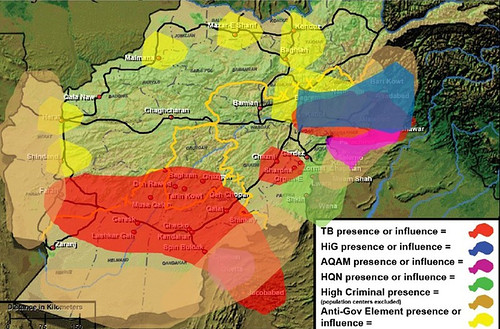 Onderstaande Amerikaanse kaart (gepubliceerd in 2008) toont goed aan dat die term correcter is dan ‘de Taliban’. Afkortingen: TB = Taliban; HiG = Hezb-e Islami (Gulbuddin), de strijdgroep van Gulbuddin Hekhmatyar; AQAM = Al Qaeda and Associated Movements; HQN = de strijdgroep van Jalaluddin Haqqani. In bruingekleurde gebieden hebben criminelen (drugsbaronnnen etc.) invloed; geel duidt op ‘overige antiregeringsgezinde groeperingen’.