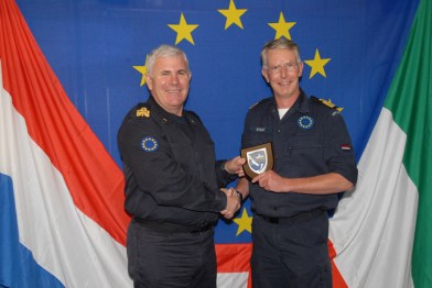 (Commandeur Pieter Bindt (r) draagt het commando over aan zijn Italiaanse ranggenoot Giovanni Gumiero. Foto Defensie)