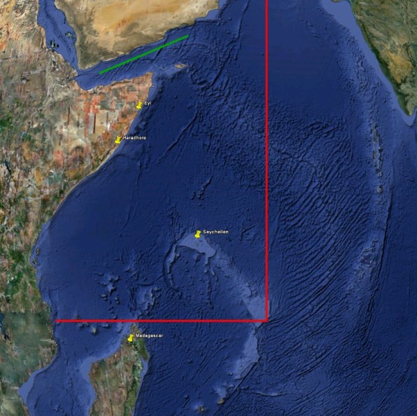 Onderstaand een afbeelding van de ‘gevarenzone’ rond Somalië. De rode lijnen geven ruwweg het enorme gebied aan waarbinnen de Somalische piraten opereren. De groene lijn is de door verscheidene marines bewaakte transitcorridor door de Golf van Aden.