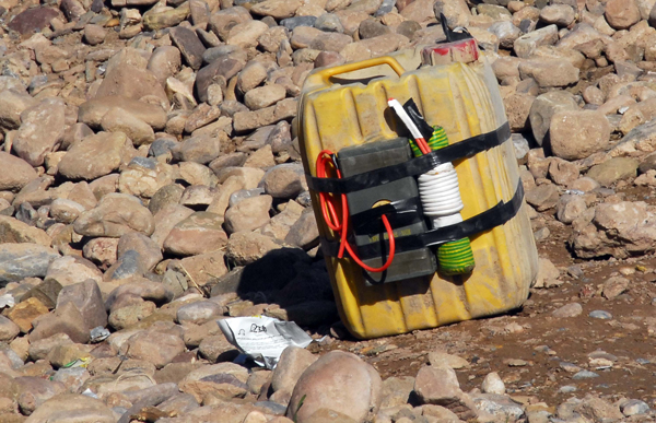 Volgens een woordvoerder van het ministerie van Defensie zijn er ook in Uruzgan IED’s op basis van ammoniumnitraat gebruikt, dan wel tijdig onschadelijk gemaakt. Ook zijn er door troepen van ISAF voorraden ammoniumnitraat in beslag genomen. Afgebeeld is een IED die recentelijk door Australische troepen in Uruzgan is aangetroffen; de jerrycan bevatte hoogstwaarschijnlijk ammoniumnitraat.