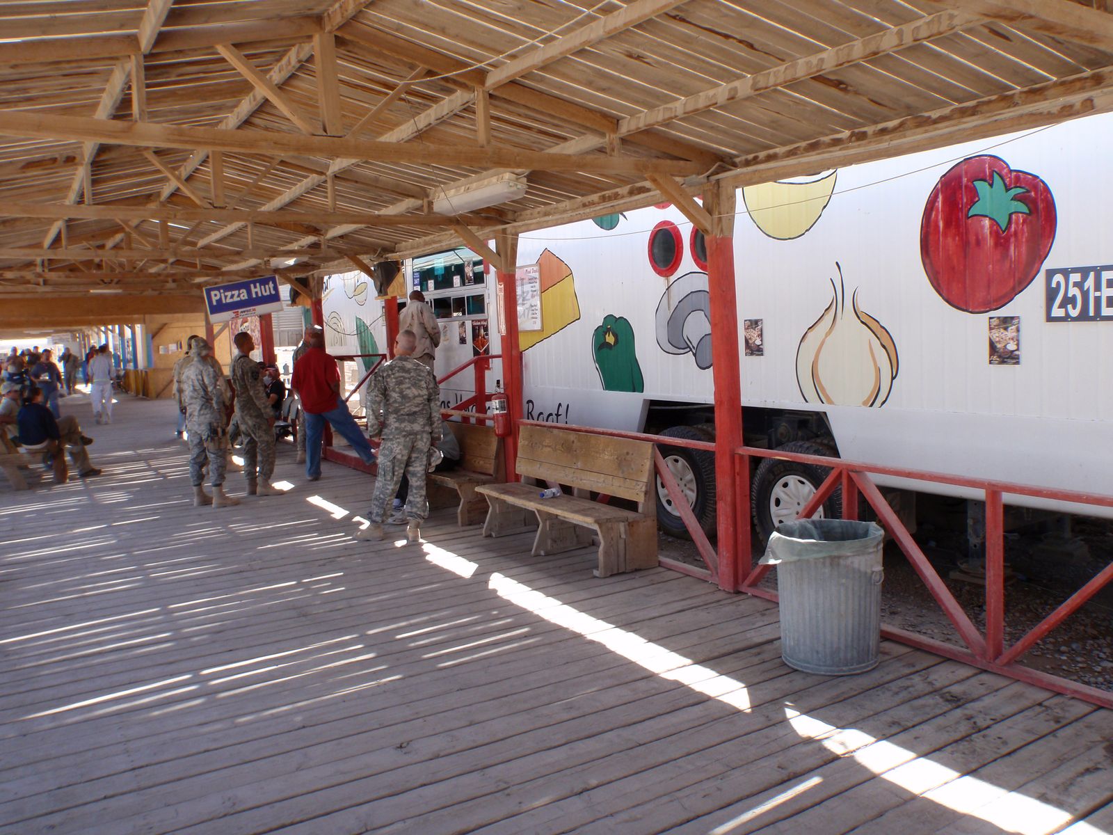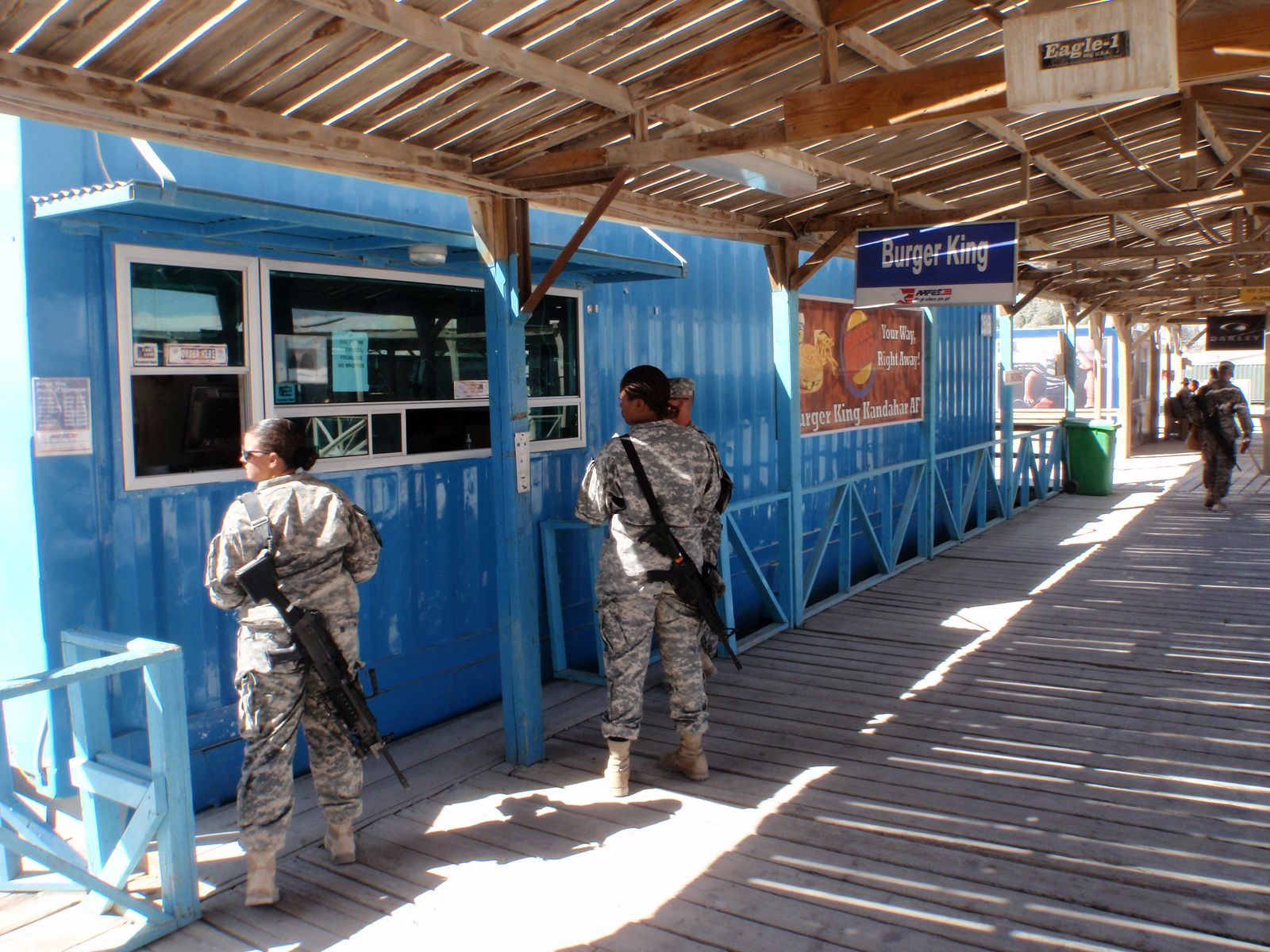 De gerenommeerde vetkramen staan op de boardwalk van ‘KAF’ zoals de basis in militair jargon genoemd wordt. Op KAF werken ook honderden Nederlandse militairen die het net als hun buitenlandse collega’s voortaan zonder buitensporigheden als een Dubbele Whopper zullen moeten doen.